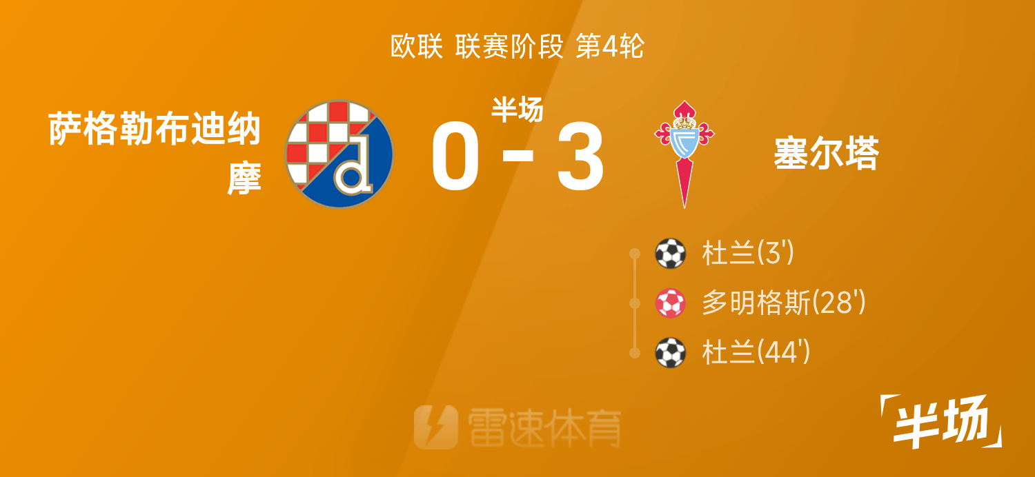 欧联半场:杜兰梅开二度,萨格勒布迪纳摩0-3塞尔塔