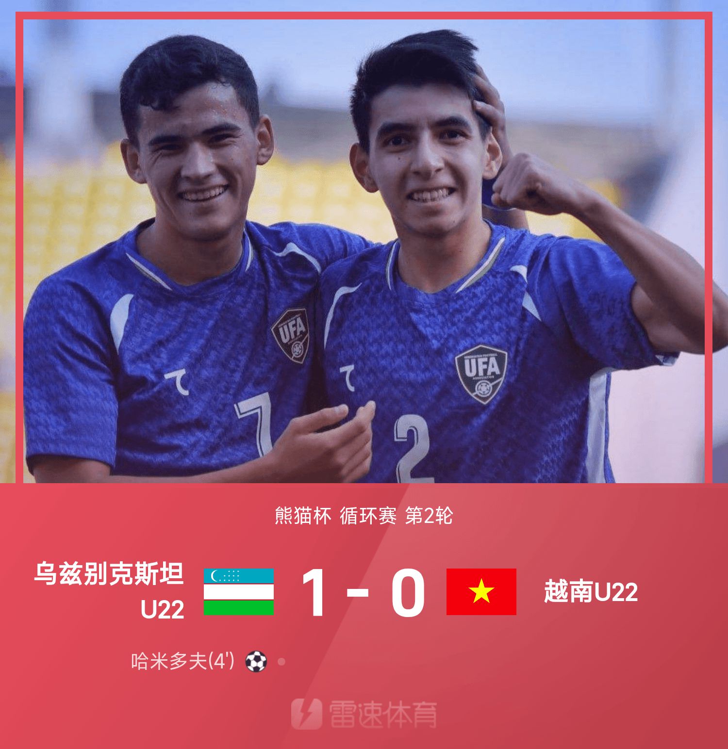 6686体育平台11月15日讯 25赛季熊猫杯循环赛第2轮,乌兹别克斯坦U22以1-0战胜越南U22。全场竞赛,哈米多夫破门建功。目前熊猫杯参赛球队仅中国U22未获得胜出局,国青首场0-1不敌越南,今晚19:35将迎来韩国国青的挑战。