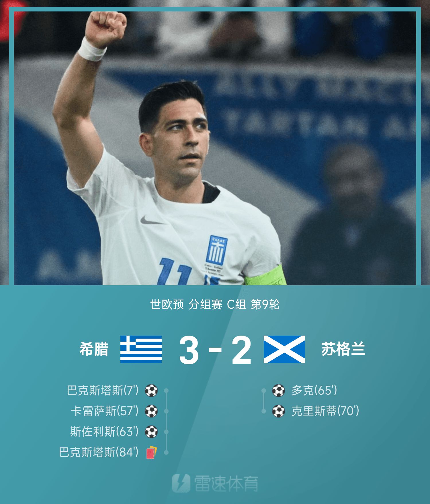 6686体育平台11月16日讯 26赛季世欧预分组赛C组第9轮,希腊3-2战胜苏格兰。全场竞赛,巴克斯塔斯传射建功后染红,斯佐利斯、卡雷萨斯破门建功,多克、克里斯蒂连扳两球难救主,苏格兰错失直通先机。