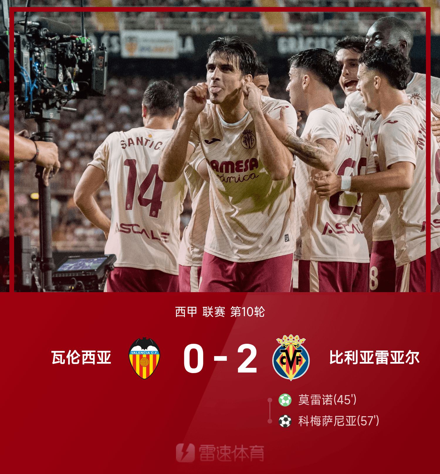 6686体育平台10月26日讯 25/26赛季西甲联赛事第10轮,比利亚雷亚尔2-0战胜瓦伦西亚。第45分钟,莫雷诺造点并亲自主罚命中,300场里程碑破门;第57分钟,科梅萨尼亚跟进射门破门锁定胜局。