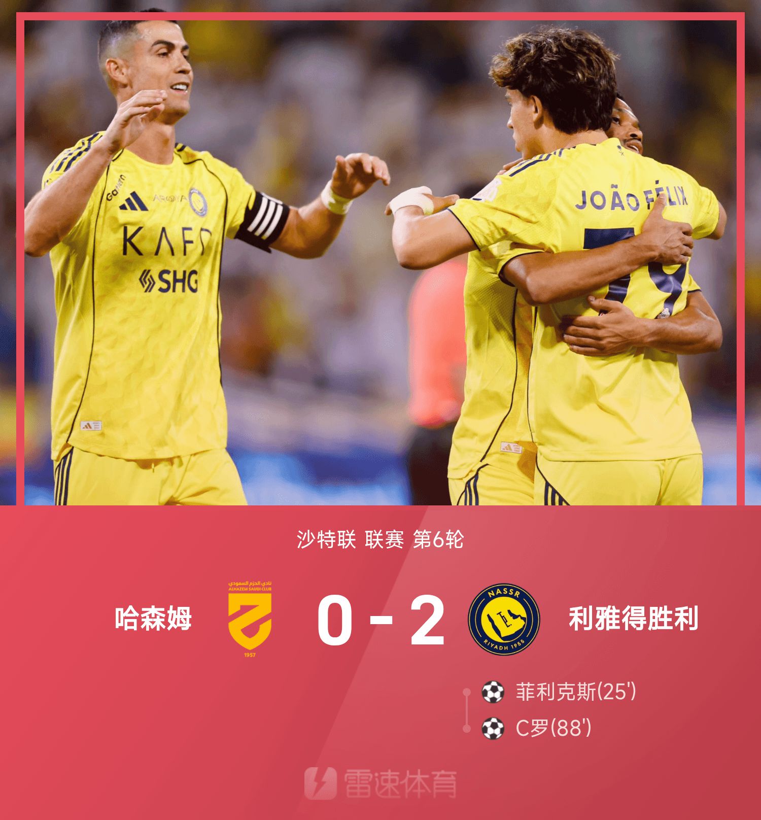 6686体育平台10月26日讯 25/26赛季沙特联联赛事第6轮,利雅得胜出局2-0战胜哈森姆。上半场菲利克斯顶球破僵,下半场终结前,C罗吊射锁定胜局。最终,利雅得胜出局客队场2-0战胜哈森姆,豪取联赛事6连胜。