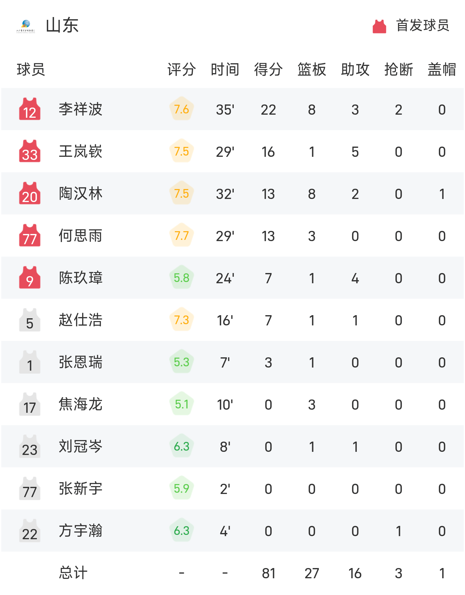 6686体育平台11月06日讯 全运男篮分组赛,浙江对阵山东。双方全场战罢,浙江85-81战胜山东。余嘉豪得到18分9板1助率队取胜,李祥波空砍全场最高的22分8板3助。
