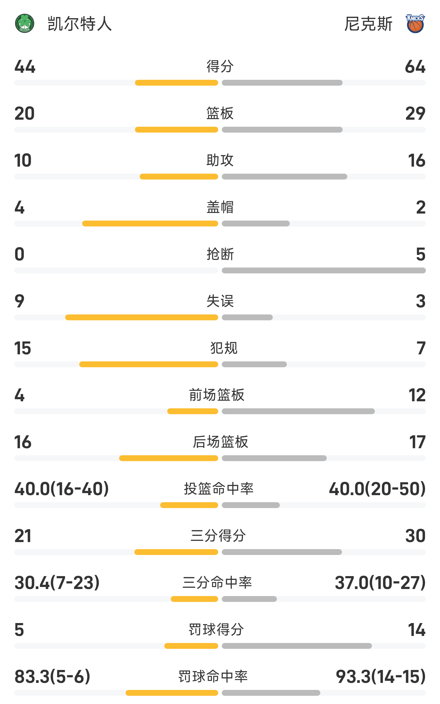 6686体育平台10月25日讯 25/26赛季NBA 常规赛,尼克斯对阵凯尔特人。双方半场战罢,尼克斯64-44领跑位凯尔特人。