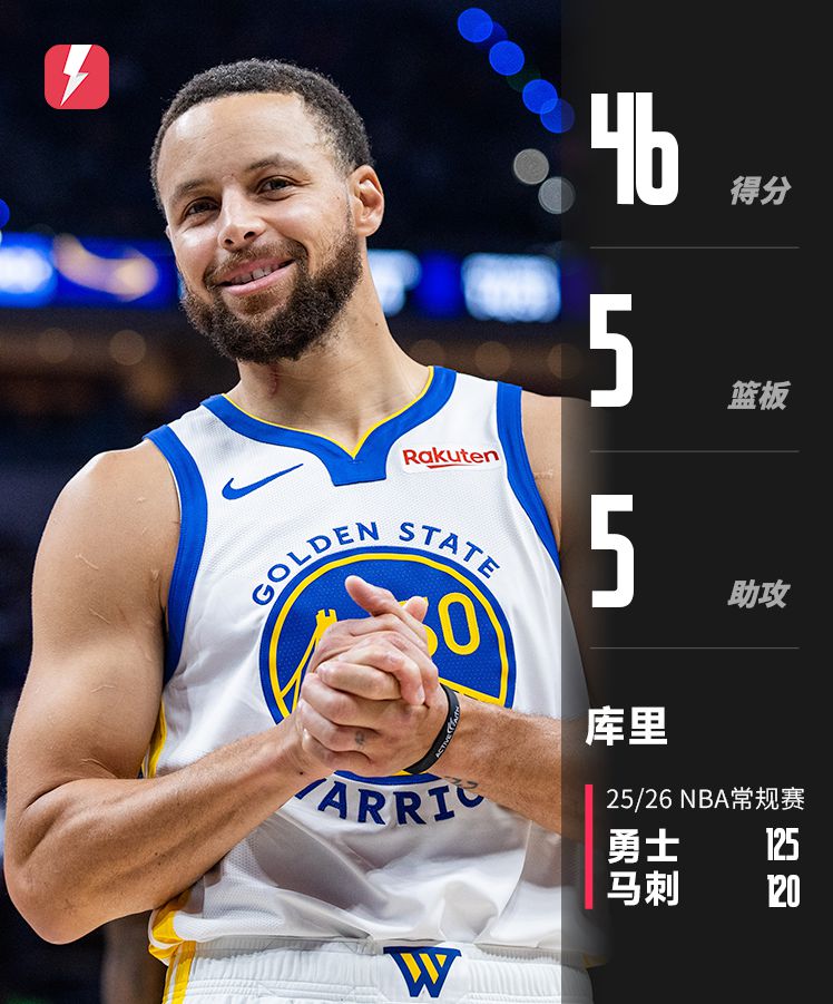 本场竞赛勇士球星库里出战33分21秒,25投13中,其中三分球16投5中,罚篮14罚13中,砍下46分5抢篮板5助攻2截球的数据。