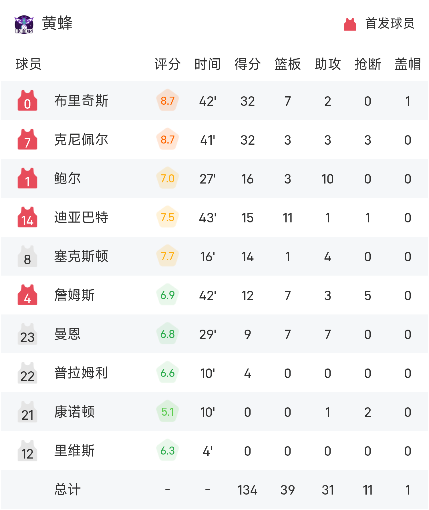6686体育平台11月15日讯 25/26赛季NBA 常规赛 NBA杯分组赛,雄鹿对阵黄蜂。双方全场战罢,雄鹿147-134战胜黄蜂。库兹马得到29分10板5助率队取胜,布里奇斯空砍全场最高的32分7板2助。