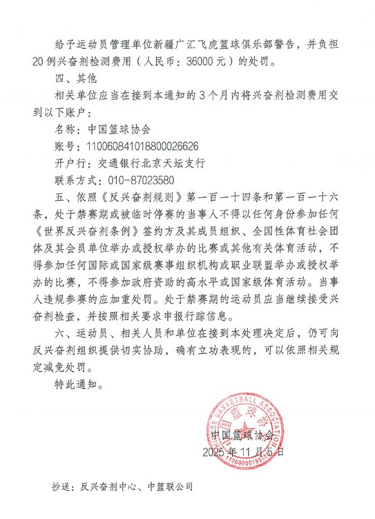 新疆男篮俱乐部医疗与反激动剂负责人吴杰被警告处;新疆男篮被警告且需承担 20例激动剂检测费用36000元。