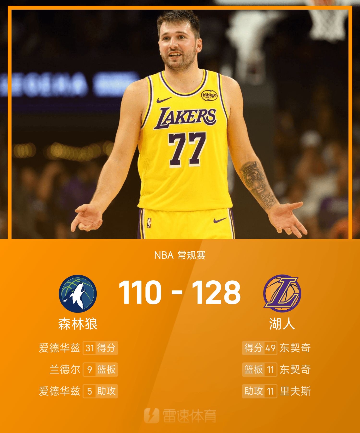 东契奇23投14中,得到49分11抢篮板8助攻。